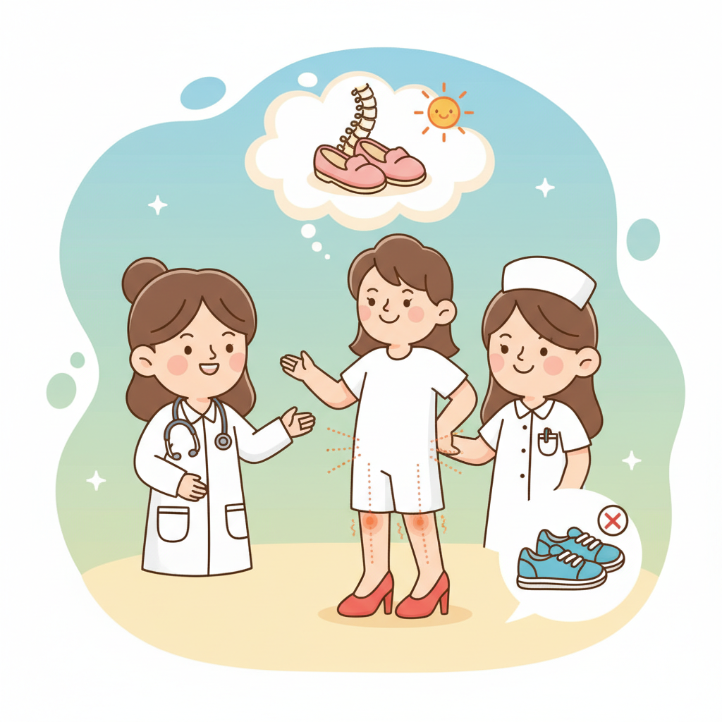 為了維持平衡,穿高跟鞋時腰部會不自覺地向前挺,這會增加腰背部肌肉的負擔,導致肌肉勞損和疼痛。長期下來,脊椎的正常生理彎曲也會受到影響,甚至可能導致脊椎變形,例如脊椎側彎。