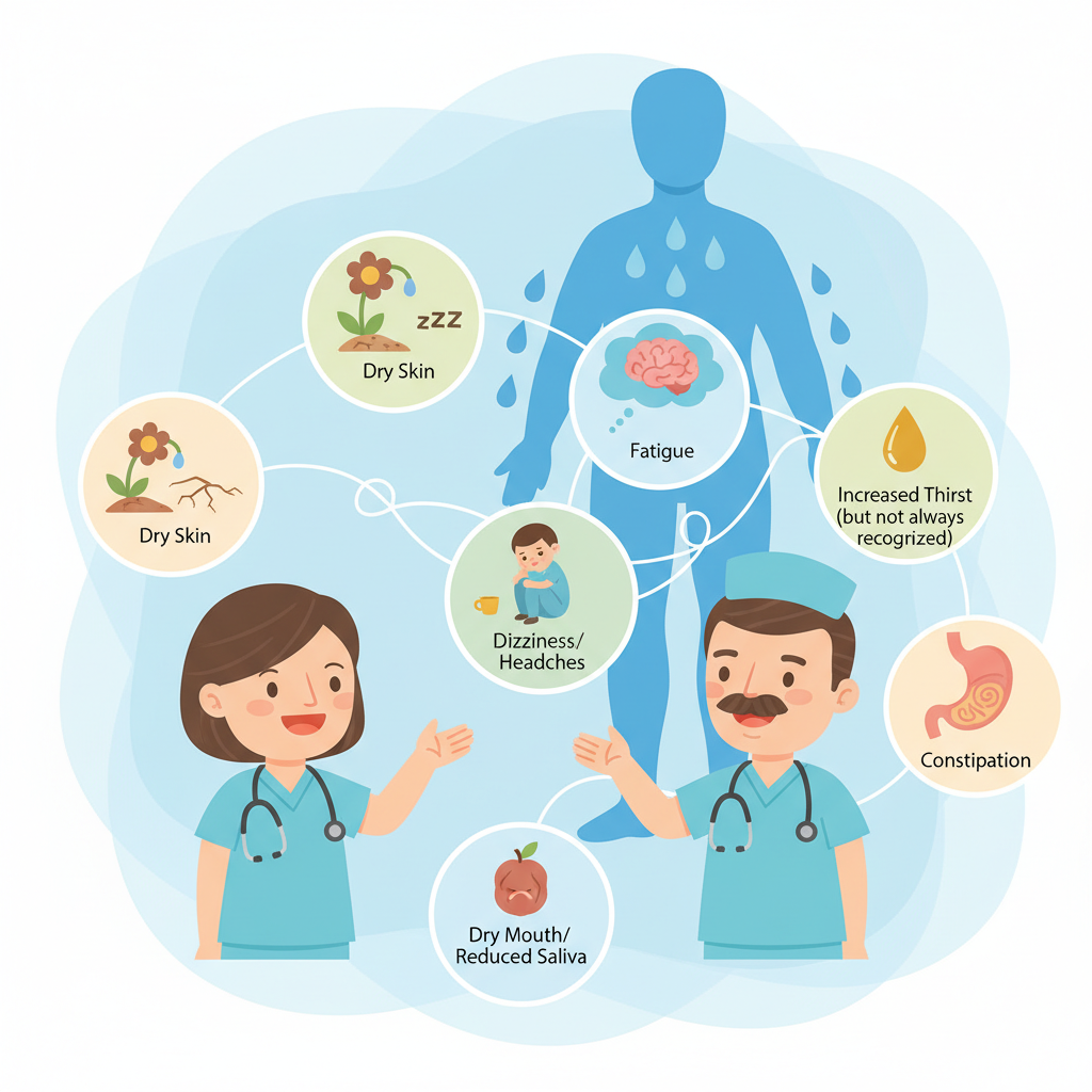口乾舌燥是最明顯的 **身體缺水** 跡象之一。當 **身體缺水** 時,唾液分泌會減少,導致口腔乾燥、不舒服。然而,有些人即使 **身體缺水** 也不會感到口渴,特別是老年人,因此需要更加注意其他缺水跡象。