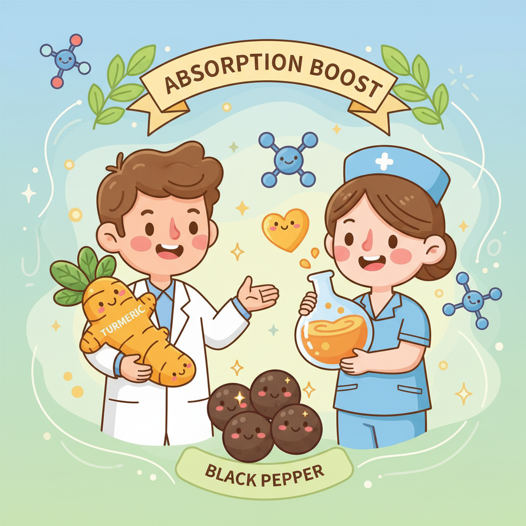 黑胡椒中含有一種叫做胡椒鹼 (Piperine) 的活性化合物。胡椒鹼具有抑制肝臟和腸道中某些酶活性的能力,這些酶會加速薑黃素的代謝。簡單來說,胡椒鹼可以減緩薑黃素被分解的速度,讓它有更多的時間被吸收進入血液。